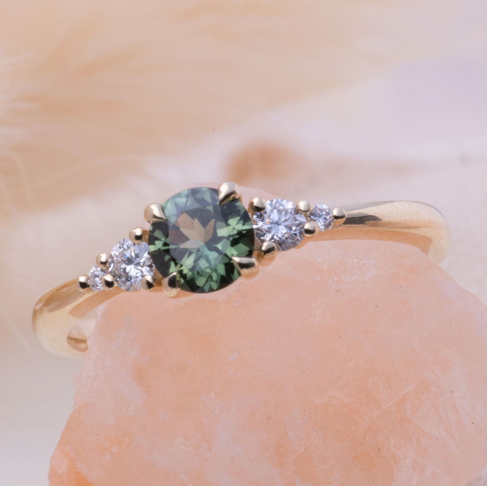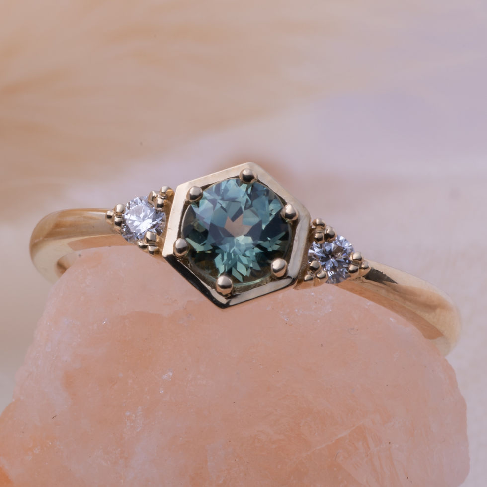 This ready to ship Ophira engagement ring centres around a beautiful ethically sourced teal round Australian Sapphire with a hexagonal setting, making it a perfect ring for lovers of minimal and elegant design. The ring sits low for a comfortable fit.